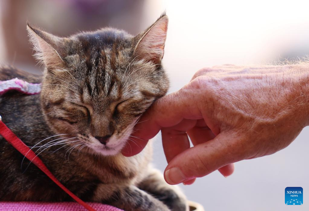 A street artist's cat is seen on the street during the 76th Festival d'Avignon in Avignon, France, July 19, 2022.