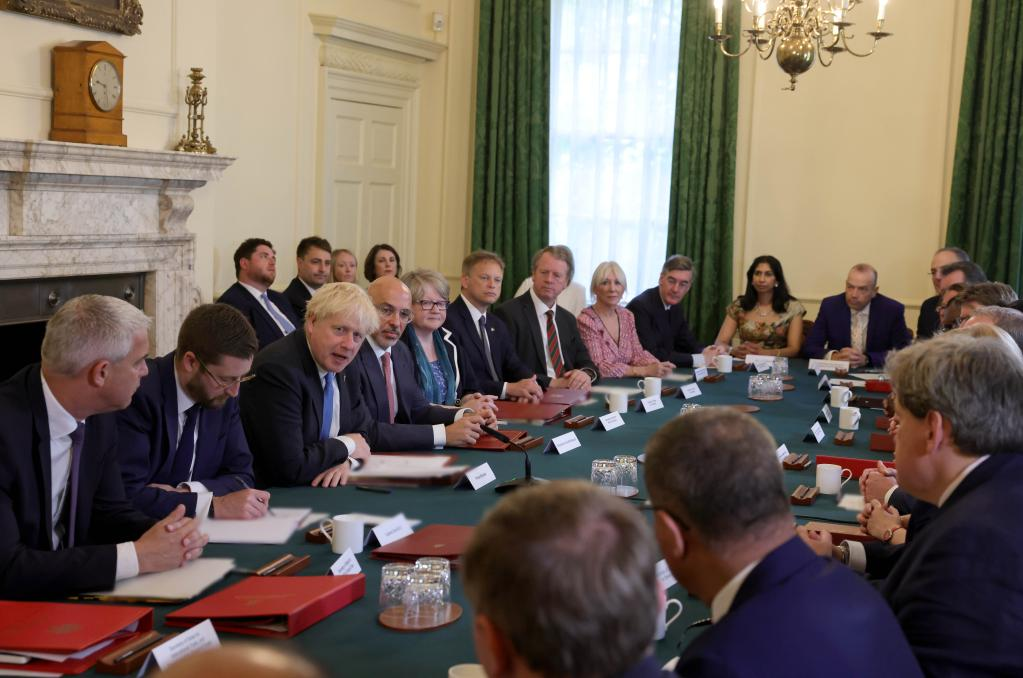 Outgoing British Prime Minister Boris Johnson (3rd L, front) chairs his last cabinet meeting in the cabinet room at 10 Downing Street in London, Britain, July 19, 2022. (Andrew Parsons/No. 10 Downing Street/Handout via Xinhua)
