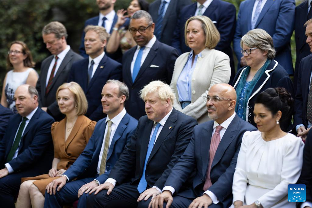 Outgoing British Prime Minister Boris Johnson (C, front) and members of the Cabinet pose for a group photo in the garden of 10 Downing Street in London, Britain, July 19, 2022. (Simon Dawson/No. 10 Downing Street/Handout via Xinhua)