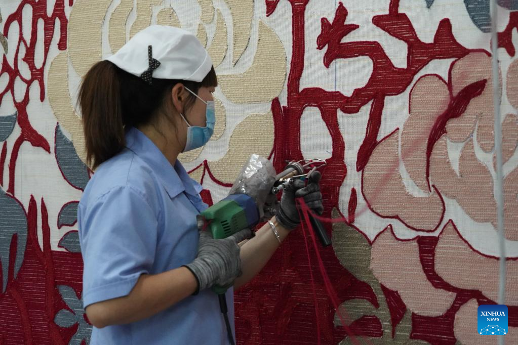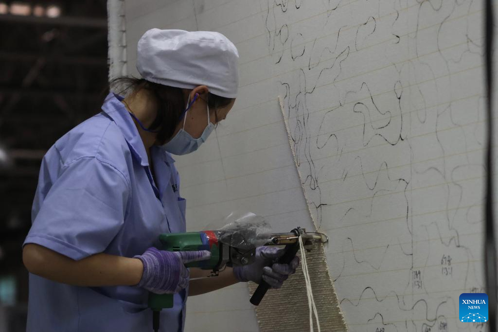 A worker makes Tibetan carpet at a factory in Xining, northwest China's Qinghai Province, July 8, 2022.
