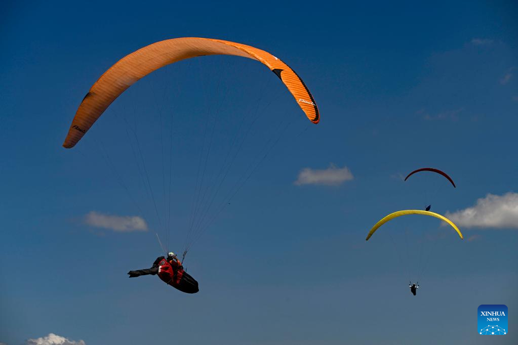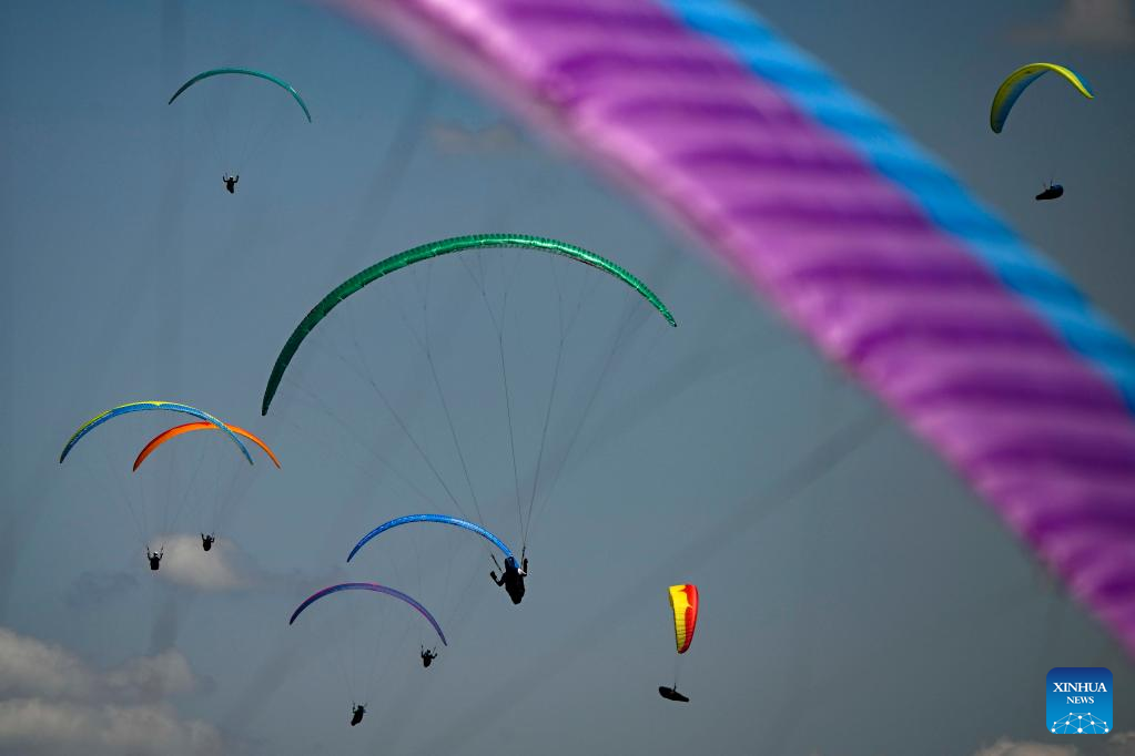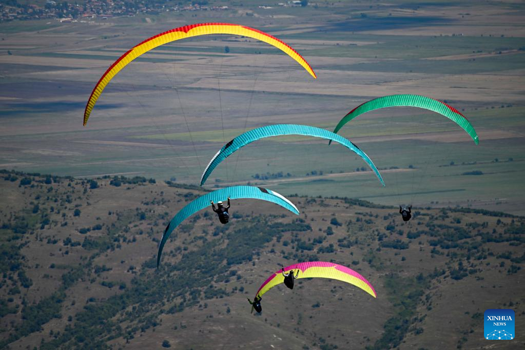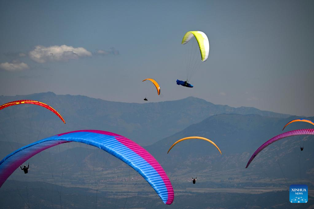 Pilots fly their paragliders during the 2022 Paragliding World Cup in Krushevo, North Macedonia, on July 20, 2022. The event is held here from July 14 to 21, 2022. (Photo by Tomislav Georgiev/Xinhua)