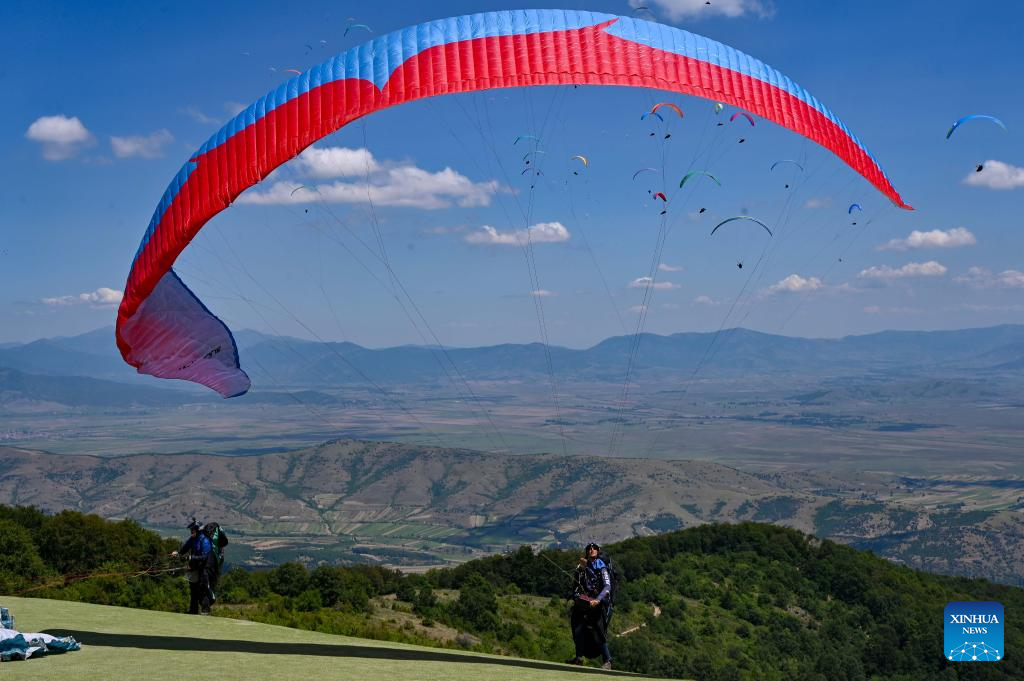 Pilots prepare during the 2022 Paragliding World Cup in Krushevo, North Macedonia, on July 20, 2022. The event is held here from July 14 to 21, 2022. (Photo by Tomislav Georgiev/Xinhua)