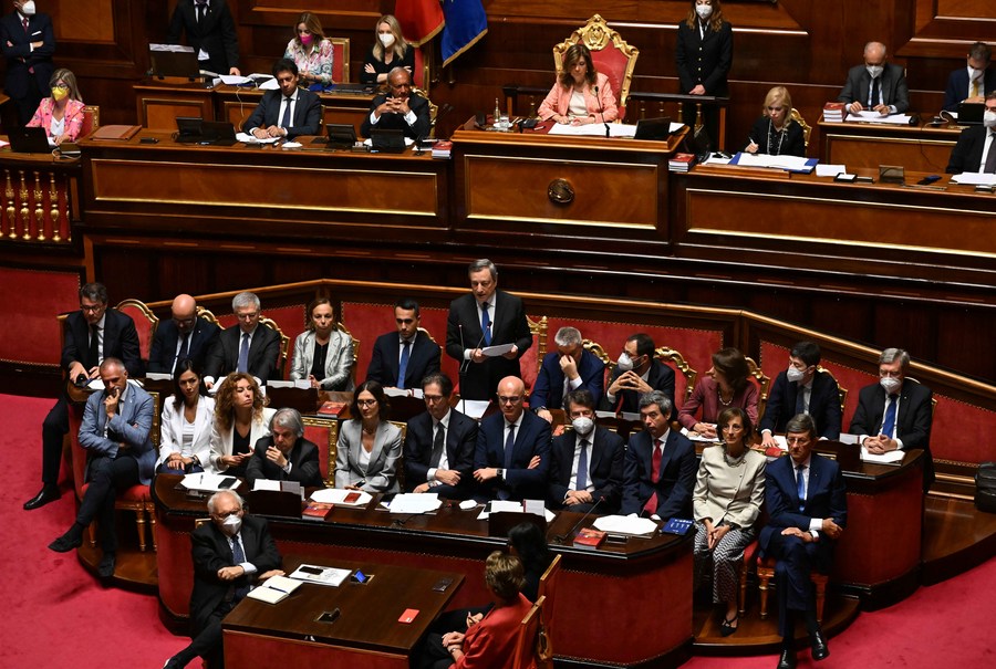 Mario Draghi (C) addresses the Senate in Rome, Italy, on July 20, 2022. (Photo by Alberto Lingria/Xinhua)