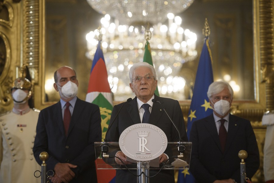 Italian President Sergio Mattarella (C) speaks at the Quirinale Palace in Rome, Italy, on July 21, 2022. (Photo by Alberto Lingria/Xinhua)