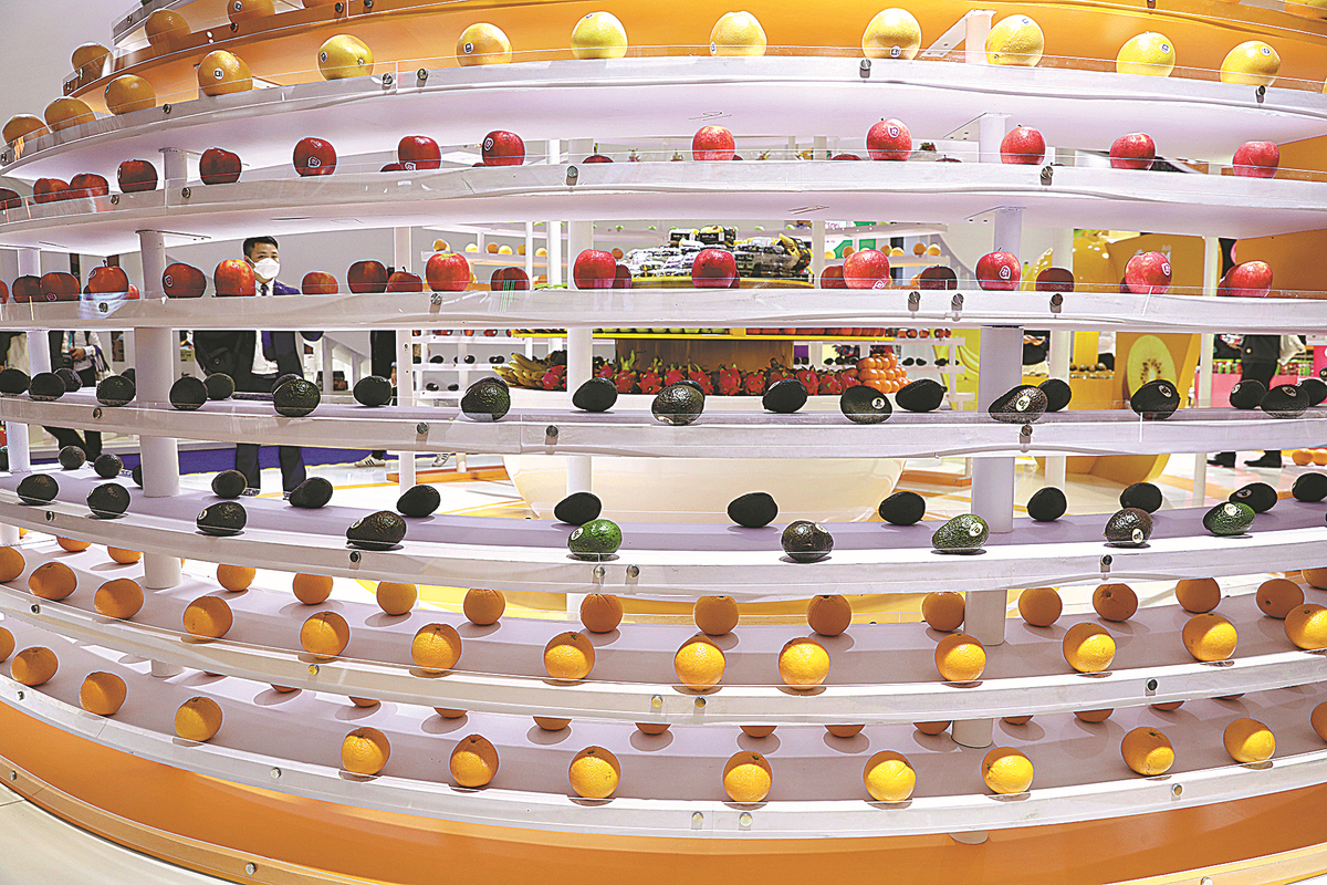 Imported fruit is displayed at the exhibition. [Photo by ZHU XINGXIN/CHINA DAILY]