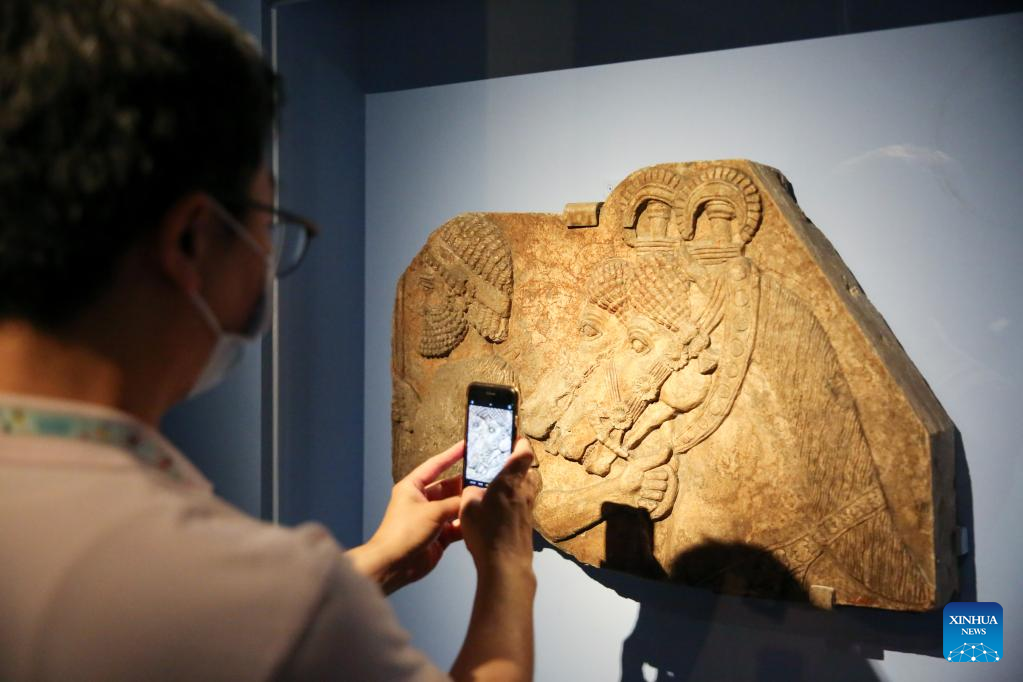 A visitor takes photos of an exhibit at the Mesopotamian Gallery of the National Museum of Korea in Seoul, South Korea, July 21, 2022. The National Museum of Korea has recently established the Mesopotamian Gallery within its Permanent Exhibition Hall and is presenting an exhibition of Mesopotamian cultural heritage. The exhibition will run from July 22, 2022 to Jan. 28, 2024. (Xinhua/Wang Yiliang)