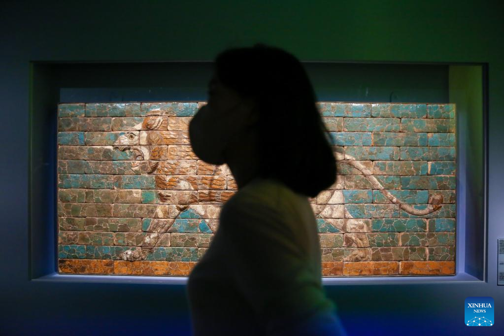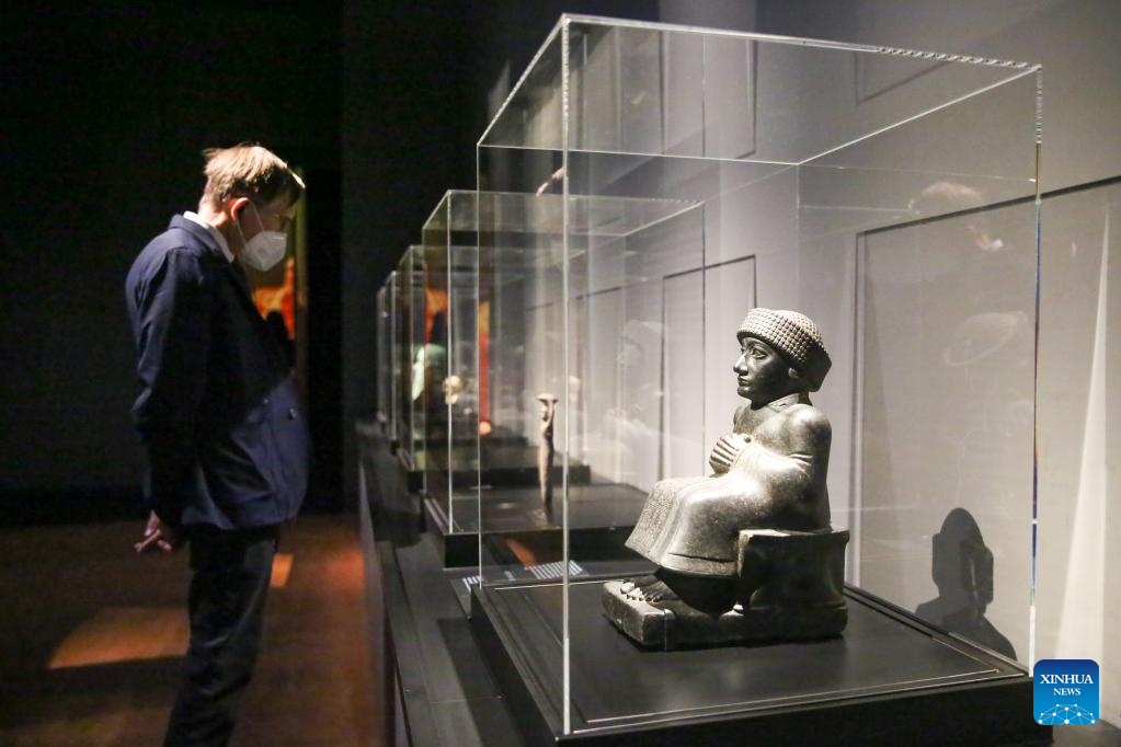A visitor views an exhibit at the Mesopotamian Gallery of the National Museum of Korea in Seoul, South Korea, July 21, 2022. The National Museum of Korea has recently established the Mesopotamian Gallery within its Permanent Exhibition Hall and is presenting an exhibition of Mesopotamian cultural heritage. The exhibition will run from July 22, 2022 to Jan. 28, 2024. (Xinhua/Wang Yiliang)
