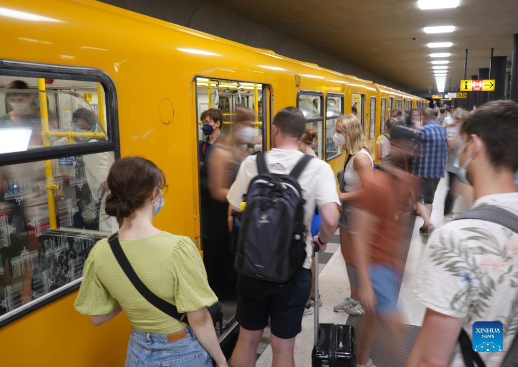 Passengers are seen at a subway station in Berlin, Germany, on July 21, 2022. Germany registered 136,624 new COVID-19 infections on Thursday, bringing the total count to over 30 million cases. Thursday's figure was around 16,000 less than a week ago, the Robert Koch Institute has said. (Photo by Stefan Zeitz/Xinhua)