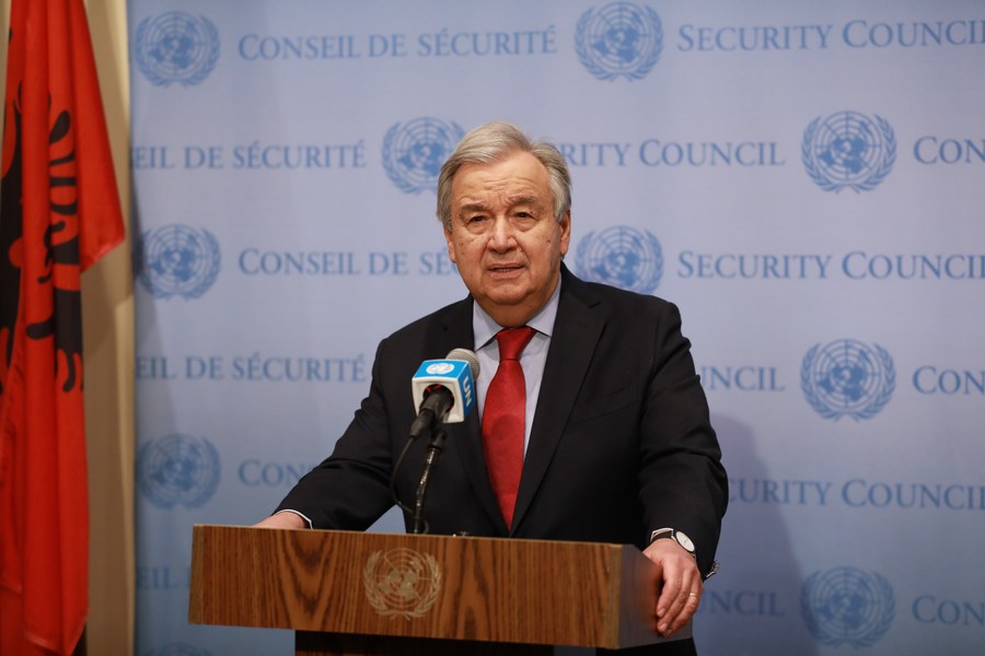 UN Secretary-General Antonio Guterres speaks to reporters at the UN Headquarters in New York, July 13, 2022. UN Secretary-General Antonio Guterres on Wednesday hailed what he called "substantive progress" in ensuring the export of Ukrainian food products through the Black Sea. (Xinhua/Xie E)