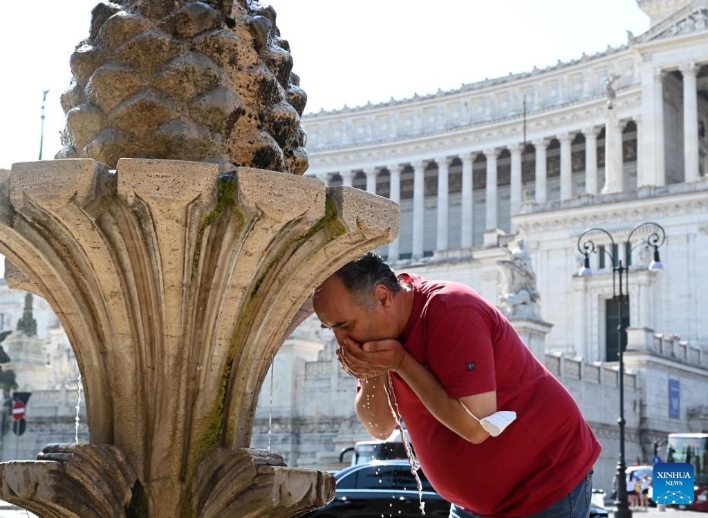 A man refreshes himself at a fountain in Rome, Italy, July 22, 2022. (Photo by Alberto Lingria/Xinhua)