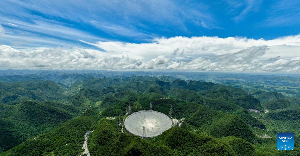 Aerial photo taken on July 20, 2022 shows China's Five-hundred-meter Aperture Spherical Radio Telescope (FAST) under maintenance in southwest China's Guizhou Province. Using FAST, also dubbed as the "China Sky Eye," scientists have identified over 660 new pulsars since October 2017. (Xinhua/Ou Dongqu)