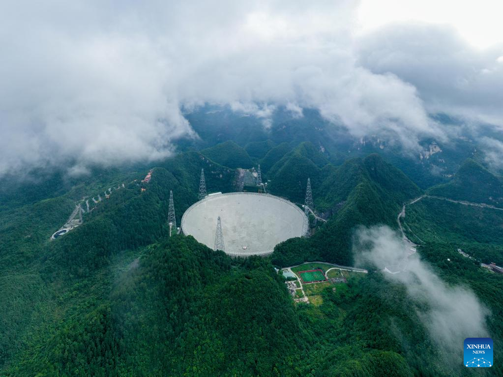 Aerial photo taken on July 21, 2022 shows China's Five-hundred-meter Aperture Spherical Radio Telescope (FAST) under maintenance in southwest China's Guizhou Province. Using FAST, also dubbed as the "China Sky Eye," scientists have identified over 660 new pulsars since October 2017. (Xinhua/Ou Dongqu)