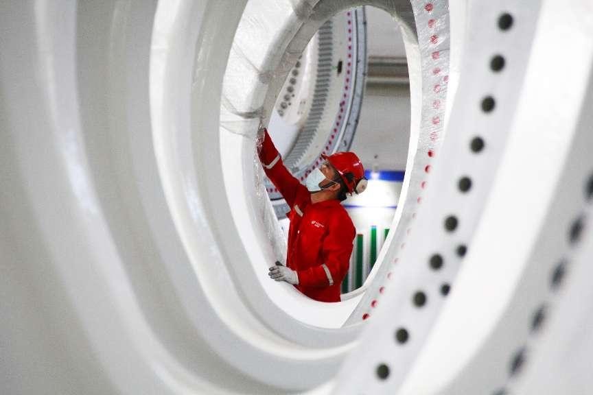 A worker is working in a general assembly workshop of a wind power equipment supplier in Hami, northwest China's Xinjiang Uygur autonomous region, July 16, 2022. (People's Daily Online/Xu Xinghan)