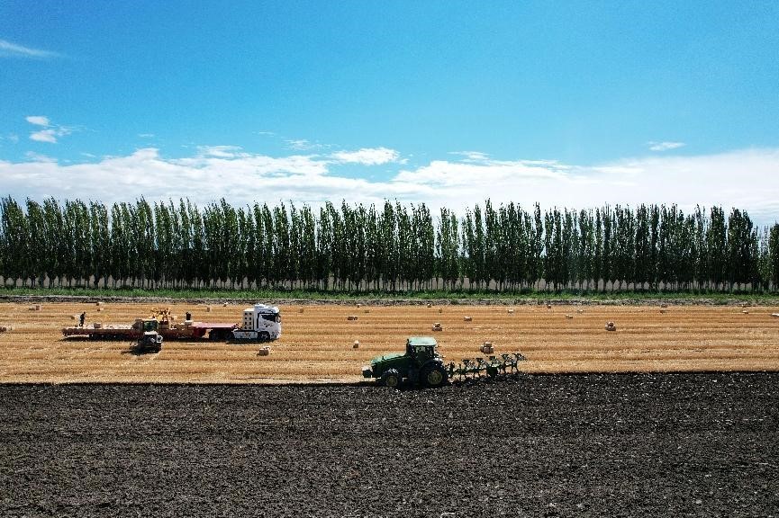 A powerful tractor ploughs in a field in Bayingolin Mongolian autonomous prefecture, northwest China's Xinjiang Uygur autonomous region, July 20, 2022. (People's Daily Online/Xie Jianglin)