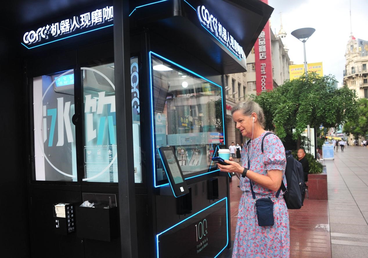 A foreign tourist orders a cup of coffee at an unattended coffee booth on the Nanjing Road Pedestrian Street in Shanghai, Aug. 12, 2021. (People’s Daily Online/Yang Jianzheng)