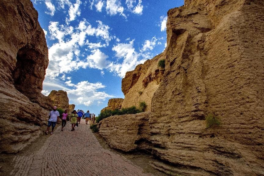 Tourists visit ruins of an ancient city in Turpan, northwest China's Xinjiang Uygur autonomous region, July 20, 2022. (People's Daily Online/ Cai Zengle)
