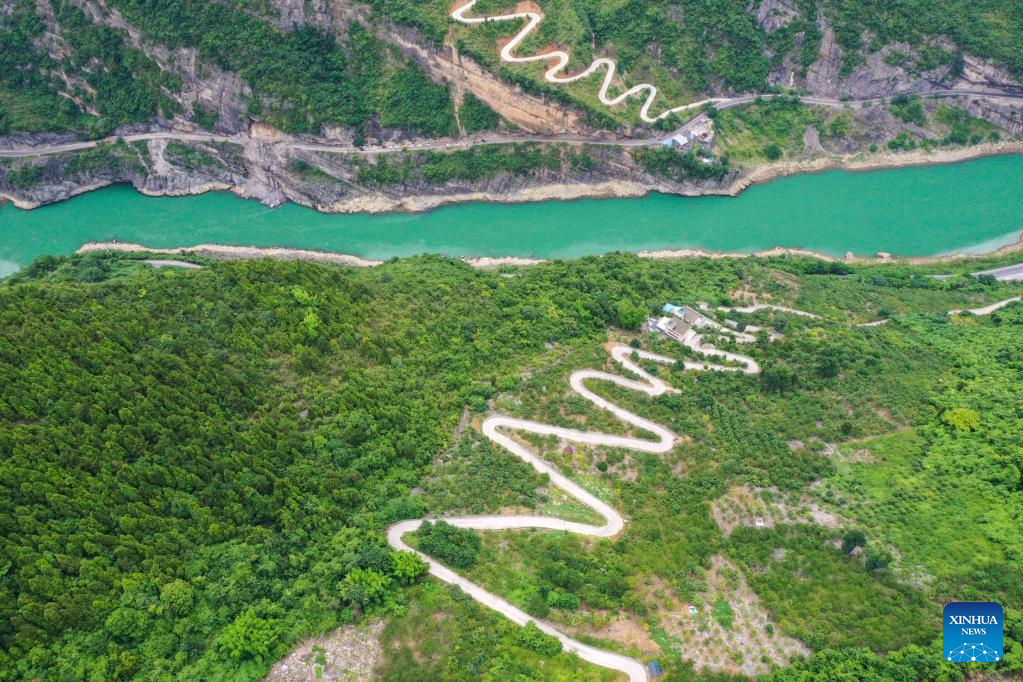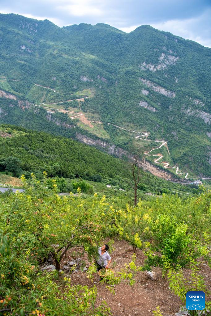 The development of agricultural industry in Wanyin Village has stagnated for a long time due to its natural environment of steep slope and barren land. Through repeated attempts, villagers finally gained more income by planting plums on the slope. In 2021, the average income raised by 30,000 yuan per grower. (Xinhua/Tang Yi)