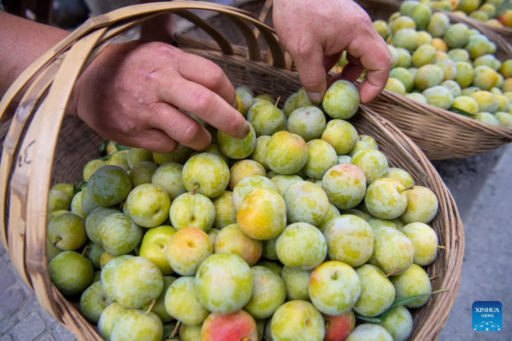 A villager sells plums to tourists in Wulong District, southwest China's Chongqing Municipality, July 22, 2022.