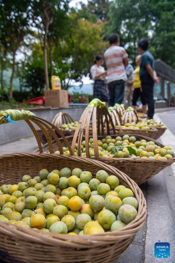 Villagers sell plums to tourists in Wulong District, southwest China's Chongqing Municipality, July 22, 2022.