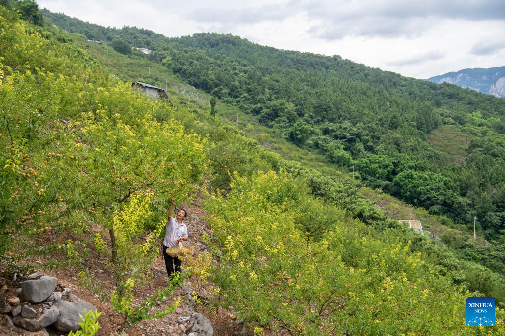 Photo taken on July 22, 2022 shows plums planted on a slope in Wanyin Village of Wulong District, southwest China's Chongqing Municipality.