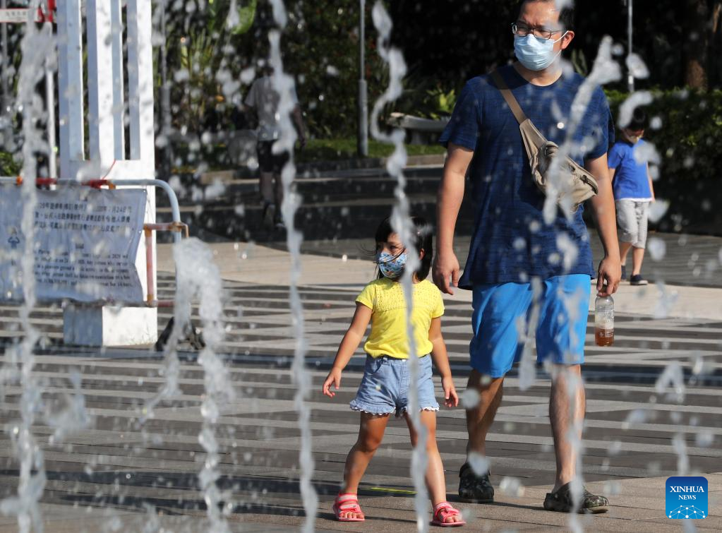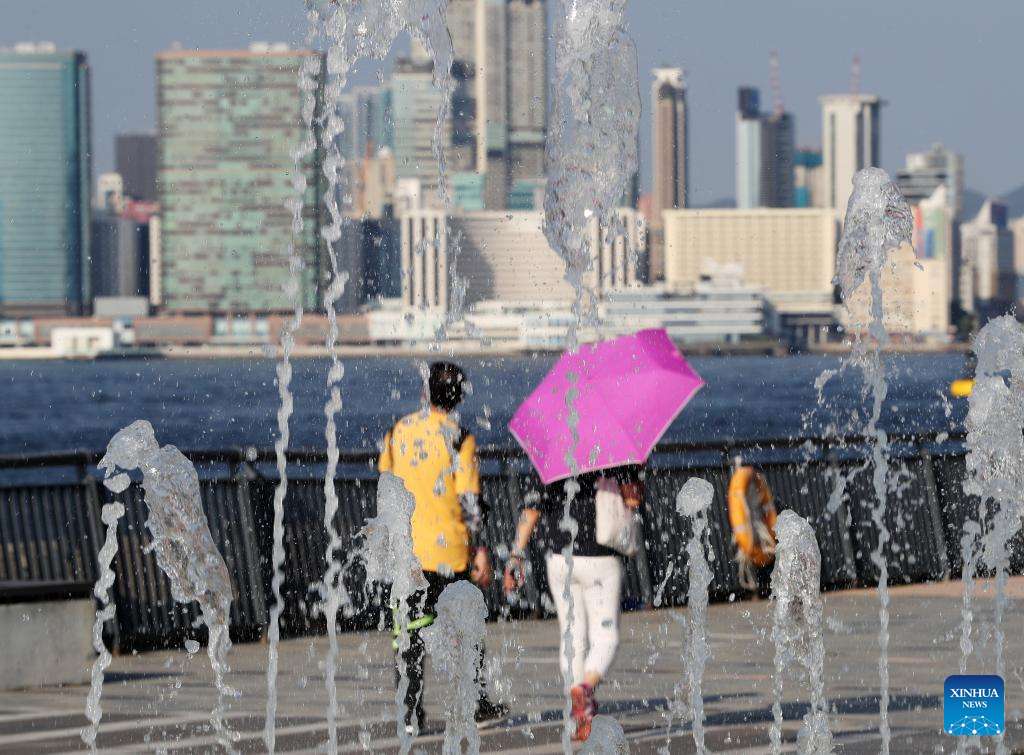 People walk past a fountain on a hot summer day in south China's Hong Kong, July 24, 2022. (Xinhua/Li Gang)