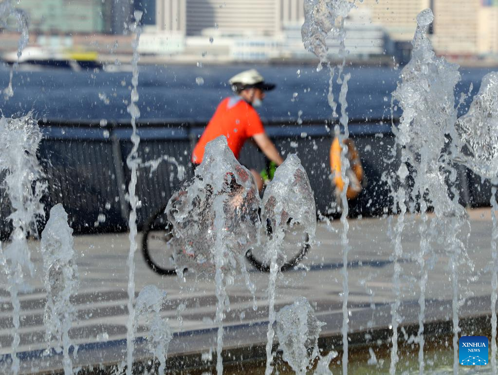A resident rides past a fountain on a hot summer day in south China's Hong Kong, July 24, 2022. (Xinhua/Li Gang)