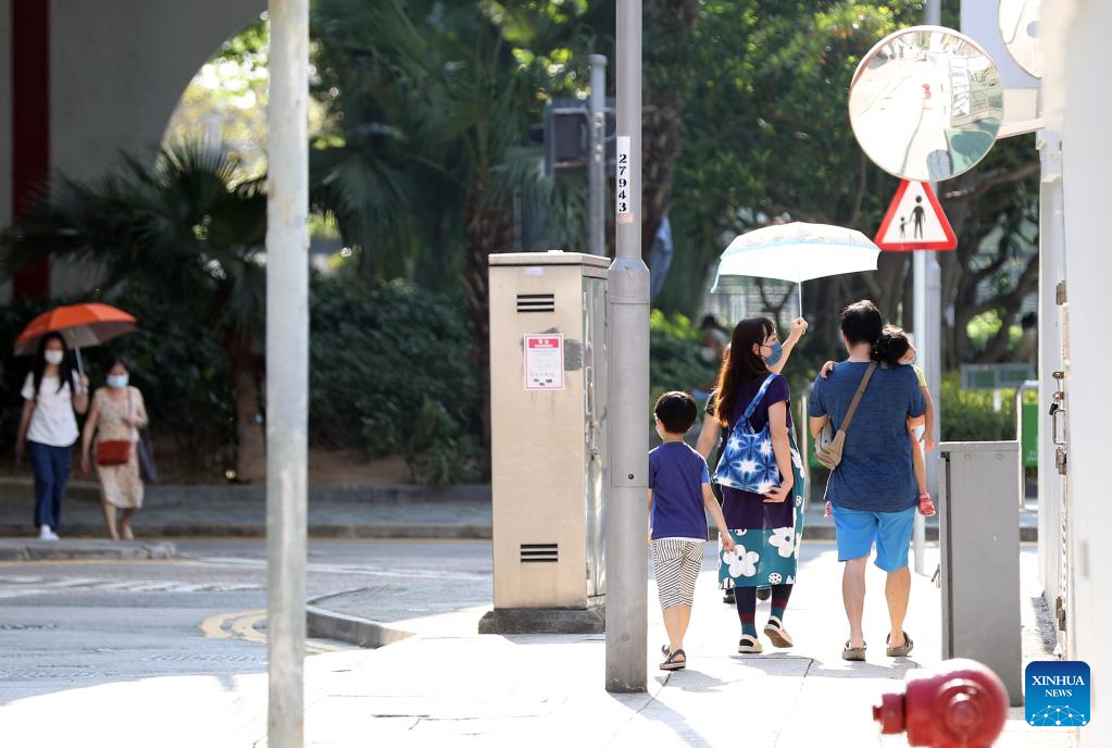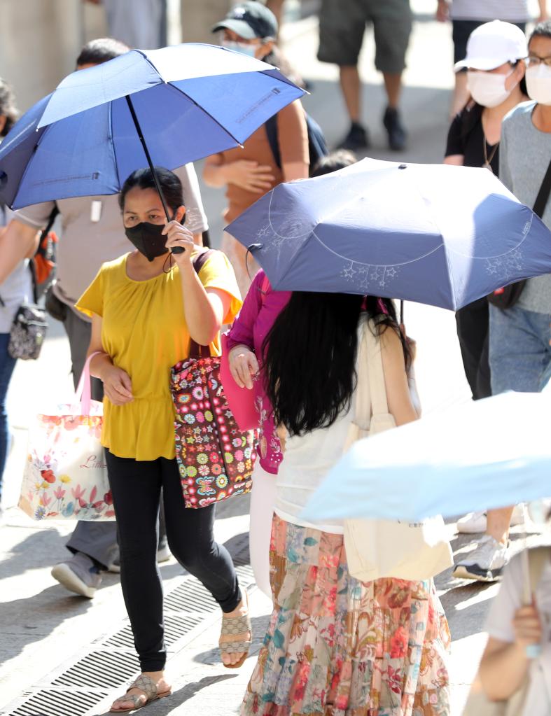 People use parasols to shelter from the sun as they walk on a street on a hot summer day in south China's Hong Kong, July 24, 2022. (Xinhua/Li Gang)
