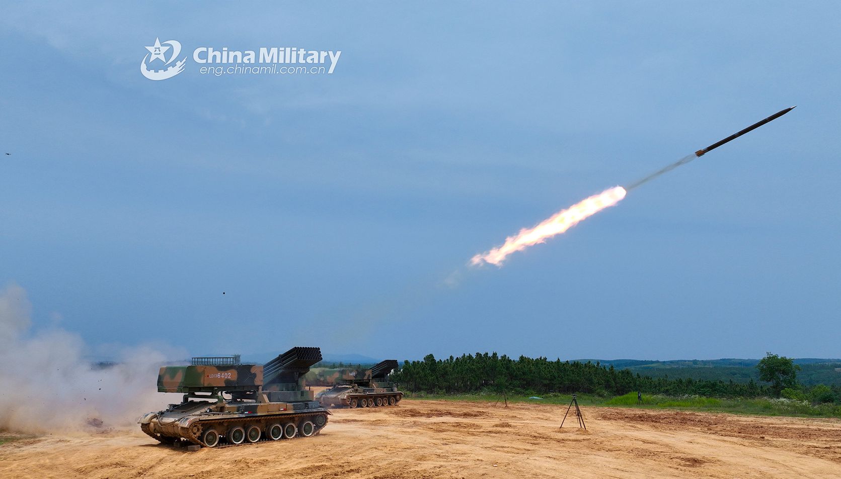 A self-propelled rocket launcher attached to an artillery detachment of a brigade of the 71st Group Army under the PLA Eastern Theater Command fires rocket at mock target in a live-fire tactical drill on June 9, 2022. (eng.chinamil.com.cn/Photo by Li Zheng)