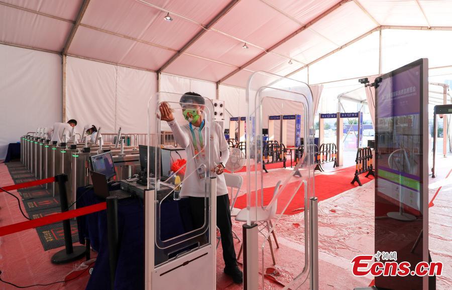 A staff member disinfects the check-in gate at the media entrance of the Hainan International Convention and Exhibition Center, the venue for the 2nd China International Consumer Products Expo in Haikou, south China's Hainan Province, July 24, 2022. (Photo: China News Service/Jia Tianyong)