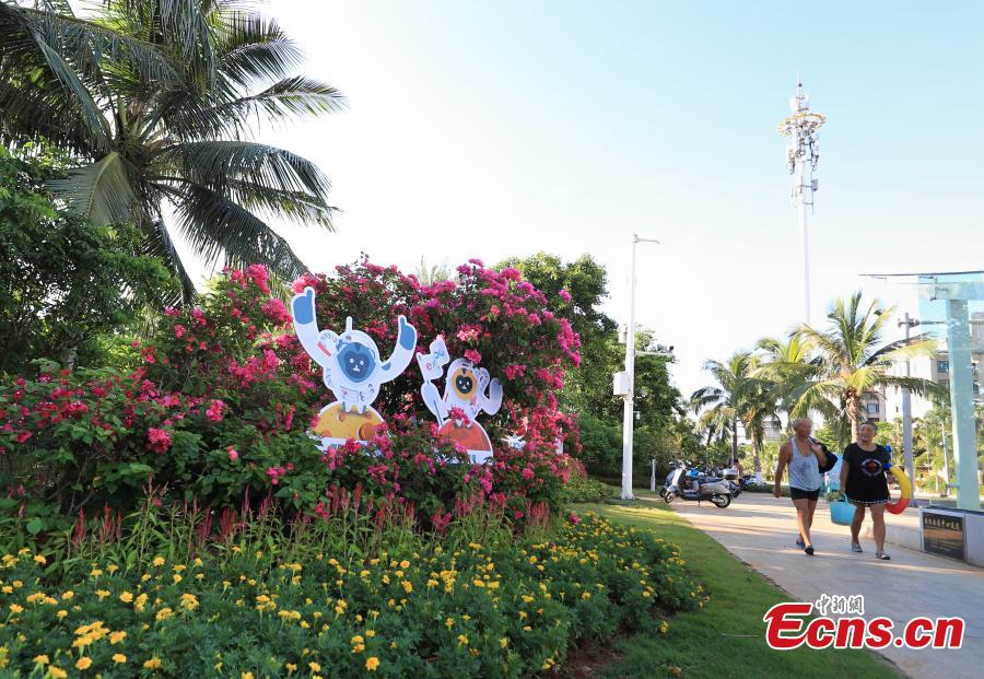 Mascots of the 2nd China International Consumer Products Expo are set up at a flower bed in Haikou, south China's Hainan Province, July 24, 2022. (Photo: China News Service/Jia Tianyong)