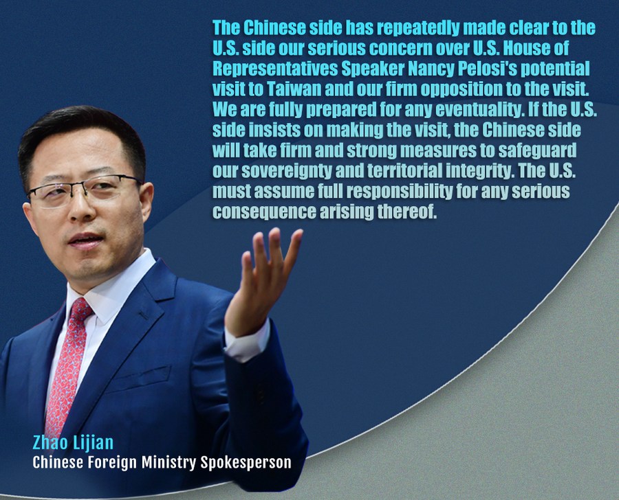 "The Chinese side has repeatedly made clear to the U.S. side our serious concern over Pelosi's potential visit to Taiwan and our firm opposition to the visit," spokesperson Zhao Lijian told a regular news briefing.