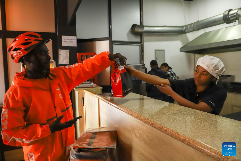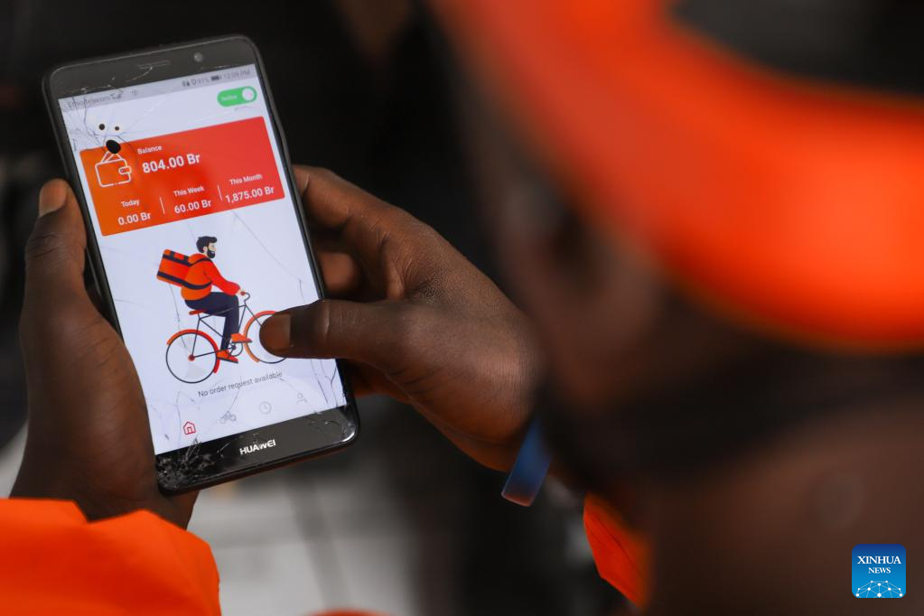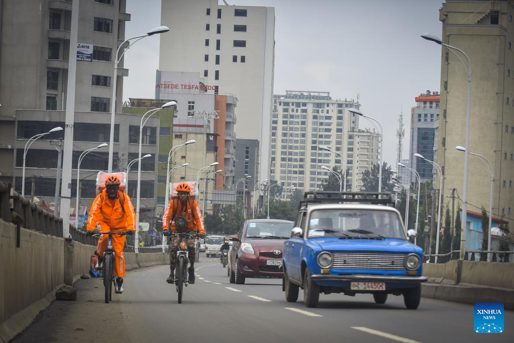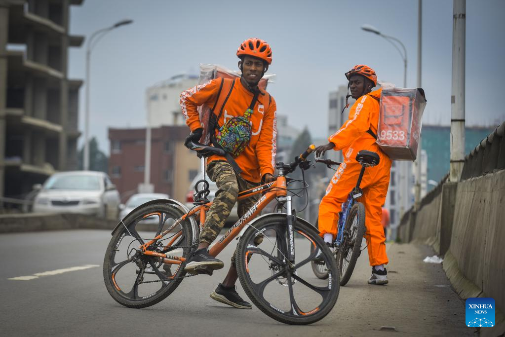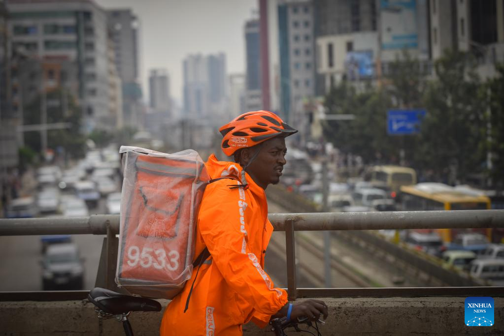 ADDIS ABABA, July 25 (Xinhua) -- On a typical sunny day in Addis Ababa, the capital of Ethiopia, Asnake Nigussie, wearing an orange uniform and a backpack, was racing on a bicycle to pick a package of food from a nearby restaurant that was ordered online minutes before.