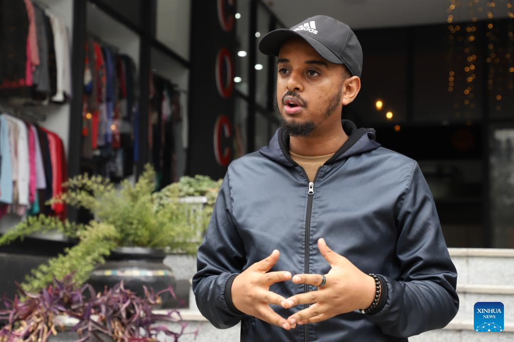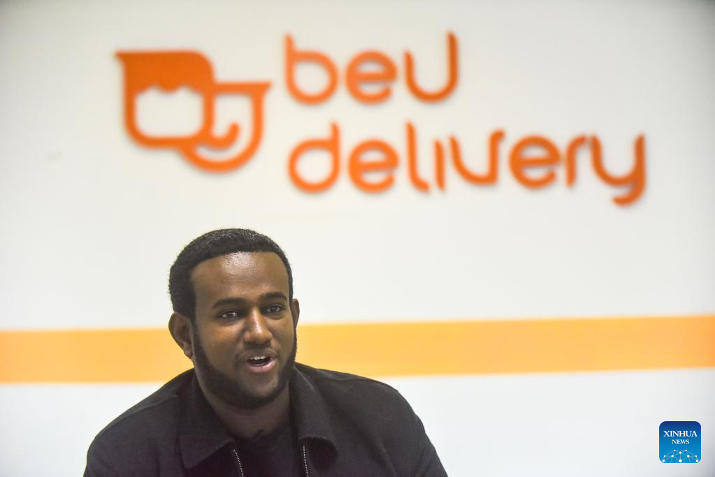 Beteab Fisha, a restaurant owner partnering with beU delivery, speaks during an interview with Xinhua in Addis Ababa, Ethiopia, on July 19, 2022. (Xinhua/Michael Tewelde)