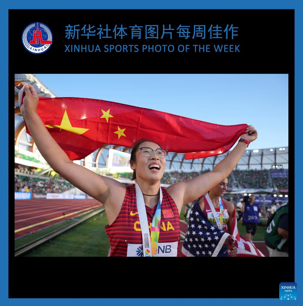 Feng Bin of China celebrates after winning the women's discus throw final at the World Athletics Championships Oregon22 in Eugene, Oregon, the United States, July 20, 2022. (Xinhua/Wang Ying)