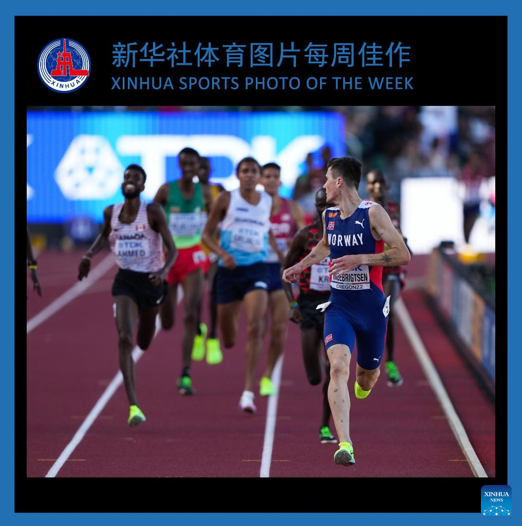 Norway's Jakob Ingebrigtsen (Front) looks back as he sprints to the finish line during the men's 5000m final at the World Athletics Championships Oregon22 in Eugene, Oregon, the United States, July 24, 2022. (Xinhua/Wang Ying)