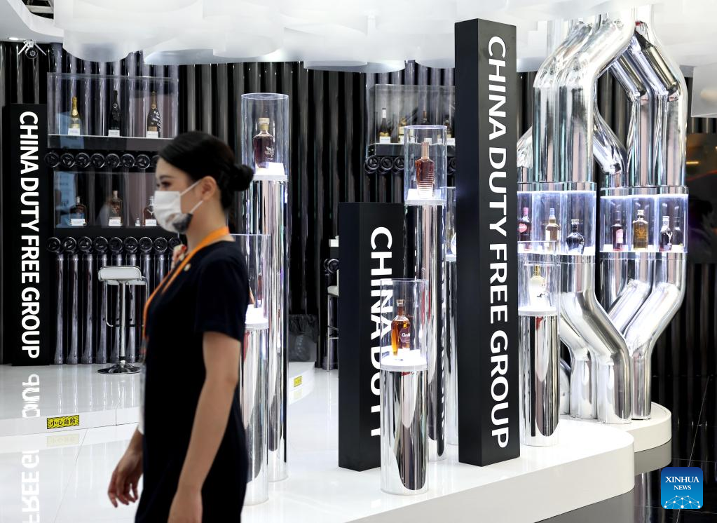 A staff member walks past the booth of China Duty Free Group at the second China International Consumer Products Expo (CICPE) in Haikou, south China's Hainan Province, July 26, 2022. The six-day expo, which kicked off on Monday in Haikou, has attracted 1,107 overseas companies and 1,643 brands from 61 countries and regions, as well as over 1,200 domestic brands.