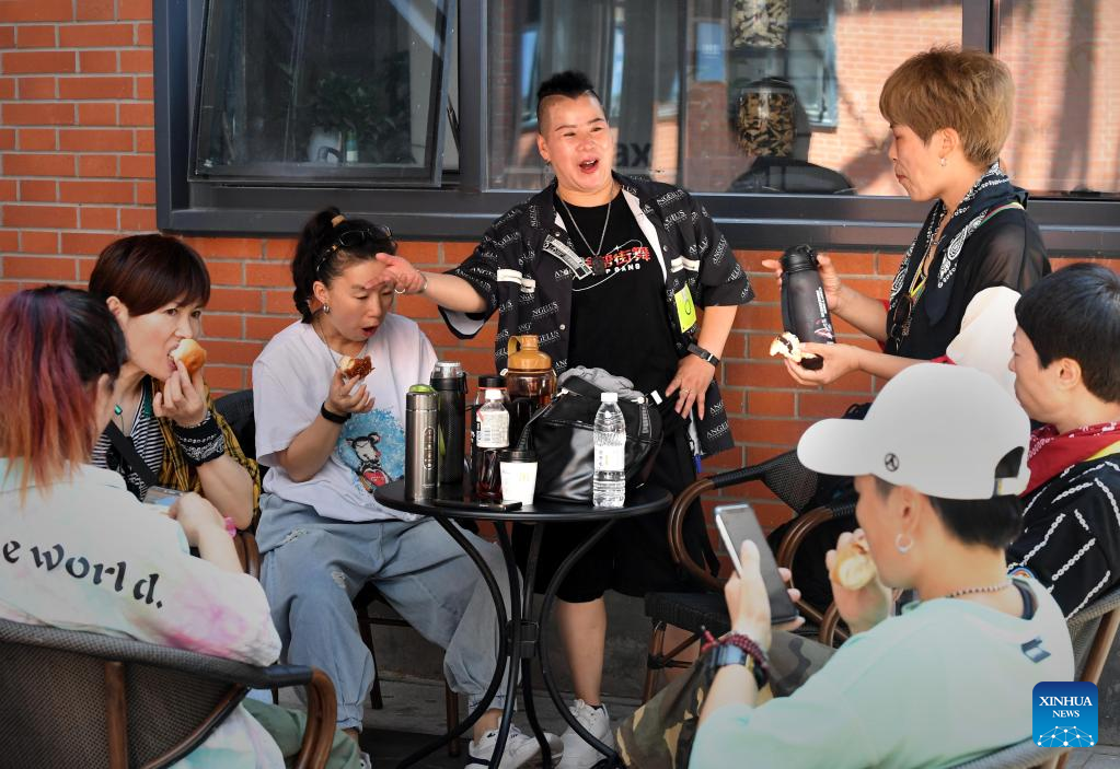 Members of Huo Mei Gui dance group prepare to take video clips in Zhengzhou, central China's Henan Province, July 21, 2022. In Zhengzhou, central China's Henan Province, there is a female street dance group Huo Mei Gui (meaning Fire Rose). Founded in 2008, the group now has 16 members of 45 to 71 years old.
