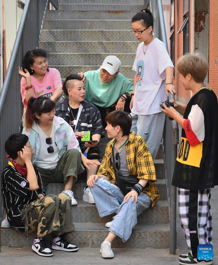 Members of Huo Mei Gui dance group have a rest during the street dance practice in Zhengzhou, central China's Henan Province, July 21, 2022. In Zhengzhou, central China's Henan Province, there is a female street dance group Huo Mei Gui (meaning Fire Rose). Founded in 2008, the group now has 16 members of 45 to 71 years old.