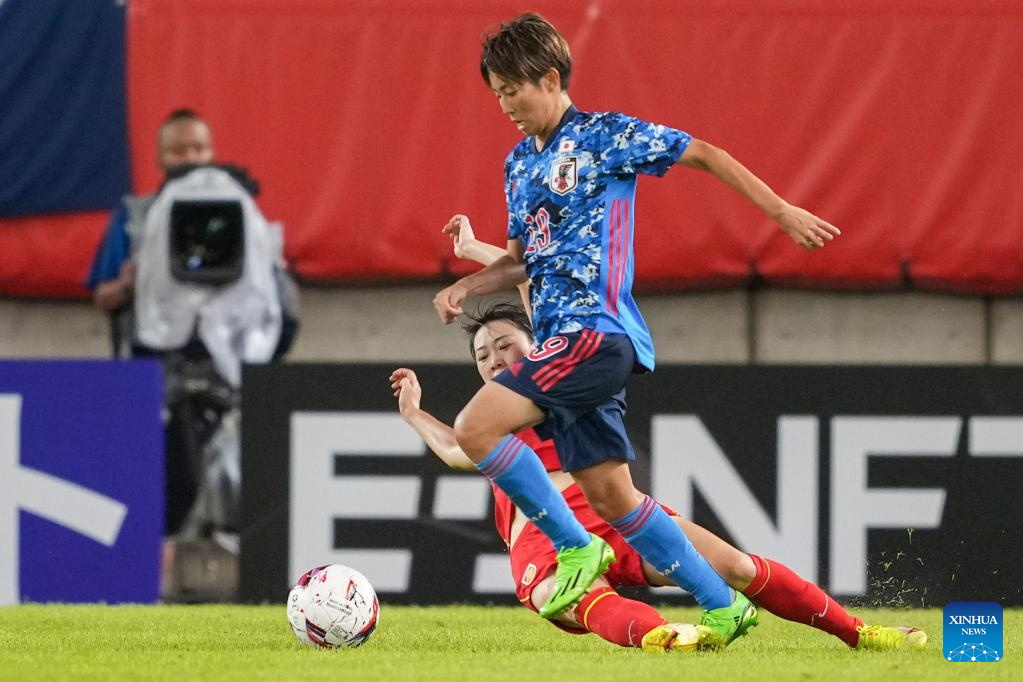 Zhang Rui (L) of China competes against Narumiya Yui (front) of Japan during a 2022 EAFF (East Asian Football Federation) E-1 Football Championship women's match at Kashima Soccer Stadium in Kashima City in Ibaraki prefecture, Japan, July 26, 2022. (Xinhua/Zhang Xiaoyu)