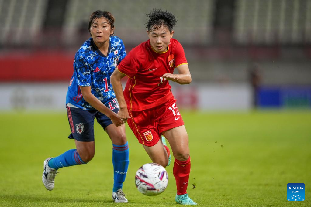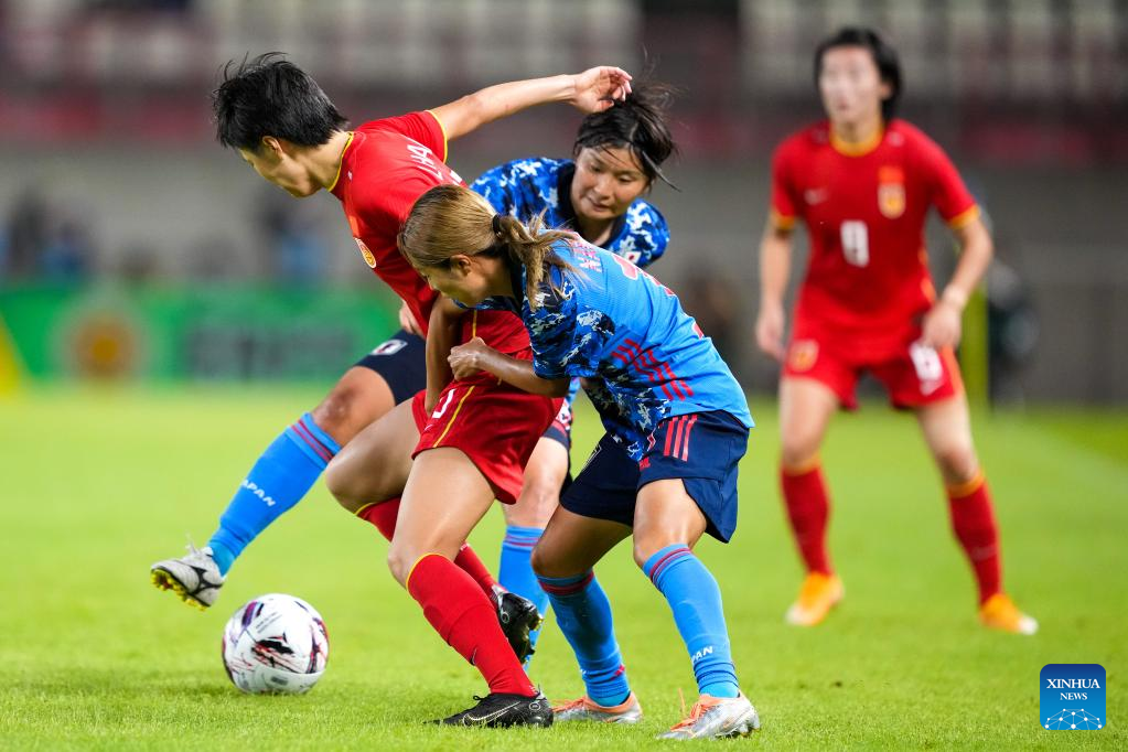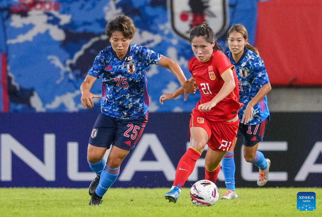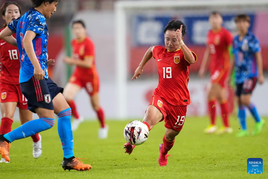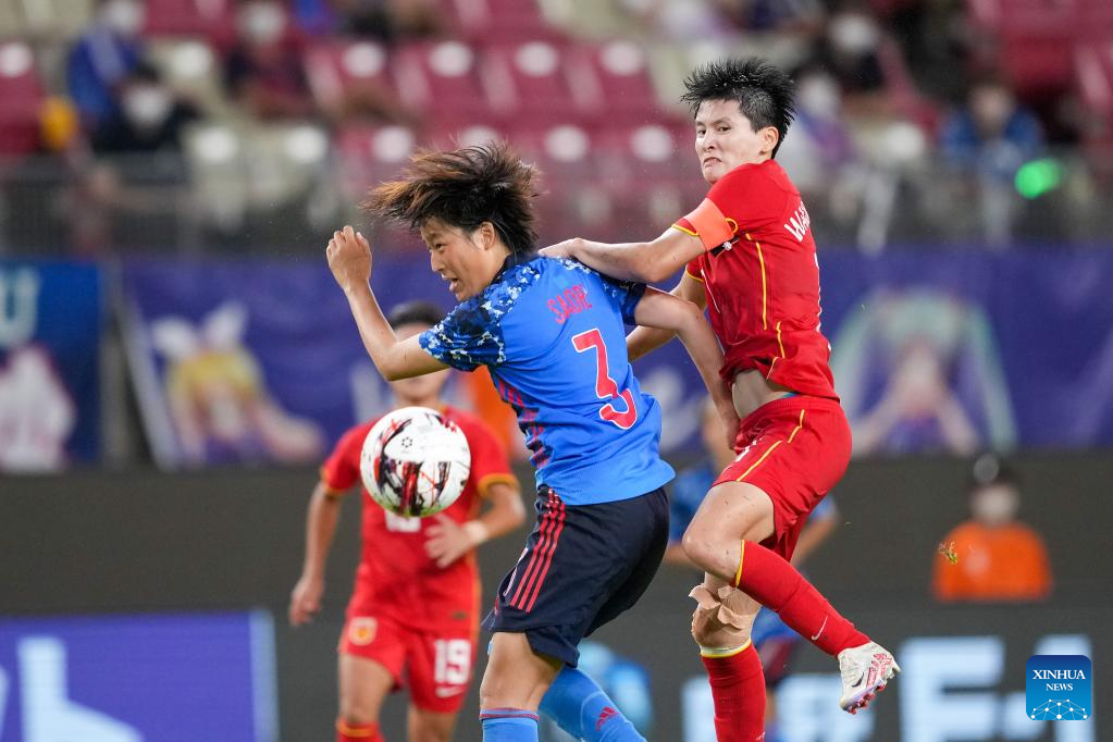 Zhang Linyan (R) of China competes during a 2022 EAFF (East Asian Football Federation) E-1 Football Championship women's match against Japan at Kashima Soccer Stadium in Kashima City in Ibaraki prefecture, Japan, July 26, 2022. (Xinhua/Zhang Xiaoyu)