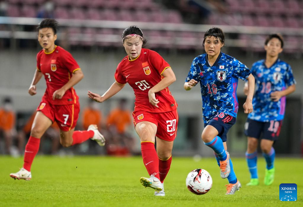 Wang Shuang (3rd R) of China vies with Nagano Fuka of Japan during a 2022 EAFF (East Asian Football Federation) E-1 Football Championship women's match at Kashima Soccer Stadium in Kashima City in Ibaraki prefecture, Japan, July 26, 2022. (Xinhua/Zhang Xiaoyu)