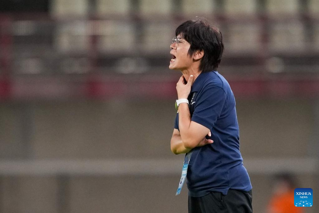 Shui Qingxia, head coach of China, instructs during a 2022 EAFF (East Asian Football Federation) E-1 Football Championship women's match against Japan at Kashima Soccer Stadium in Kashima City in Ibaraki prefecture, Japan, July 26, 2022. (Xinhua/Zhang Xiaoyu)