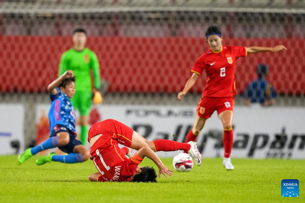 Wang Shanshan of China falls over during a 2022 EAFF (East Asian Football Federation) E-1 Football Championship women's match against Japan at Kashima Soccer Stadium in Kashima City in Ibaraki prefecture, Japan, July 26, 2022. (Xinhua/Zhang Xiaoyu)