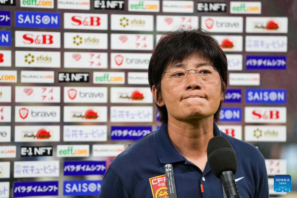 Shui Qingxia, head coach of China, receives an interview after a 2022 EAFF (East Asian Football Federation) E-1 Football Championship women's match against Japan at Kashima Soccer Stadium in Kashima City in Ibaraki prefecture, Japan, July 26, 2022. (Xinhua/Zhang Xiaoyu)