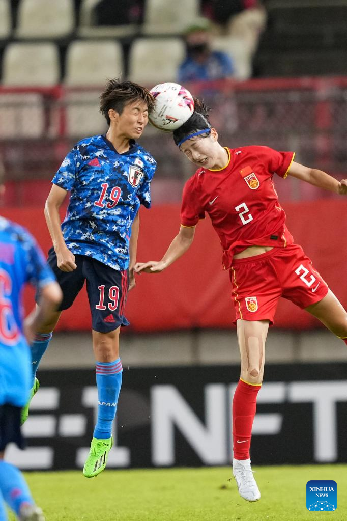 Wang Shanshan (R) of China and Takarada Saori of Japan vie for a header during a 2022 EAFF (East Asian Football Federation) E-1 Football Championship women's match at Kashima Soccer Stadium in Kashima City in Ibaraki prefecture, Japan, July 26, 2022. (Xinhua/Zhang Xiaoyu)