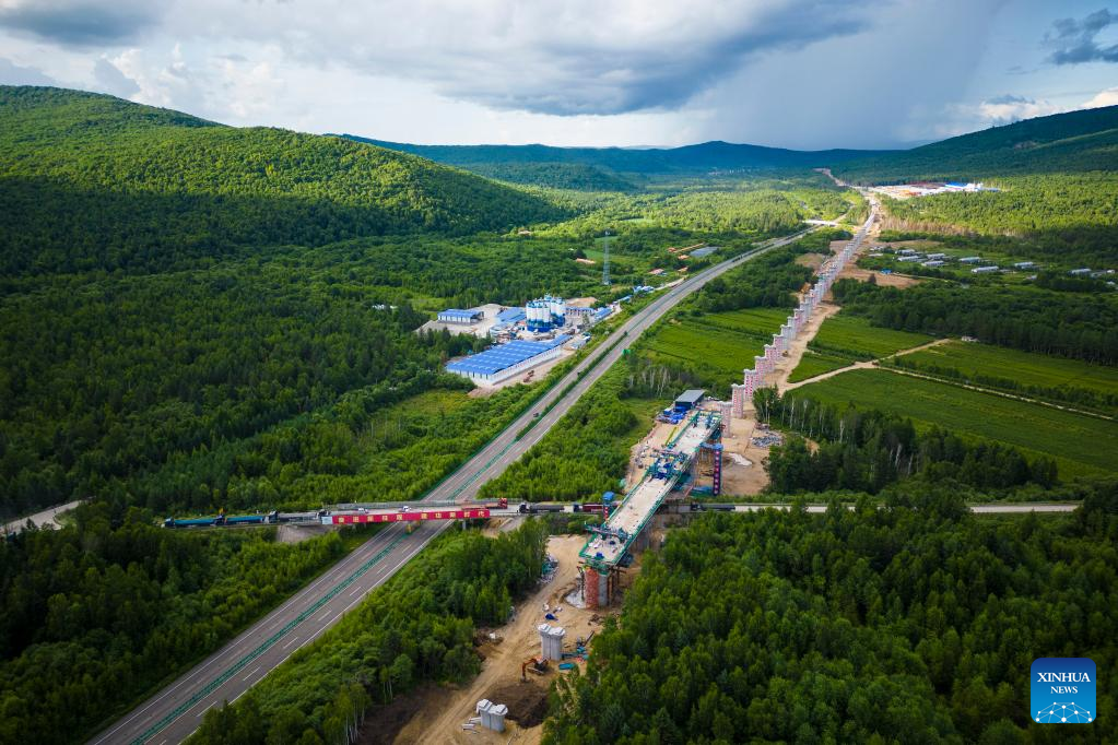 Aerial photo taken on July 25, 2022 shows the construction site of a super major bridge along the Harbin-Yichun high-speed railway, northeast China's Heilongjiang Province. Crossing permafrost regions, the Harbin-Yichun high-speed railway will total approximately 300 kilometers, connecting the cities of Harbin, Suihua, and Yichun. (Xinhua/Zhang Tao)