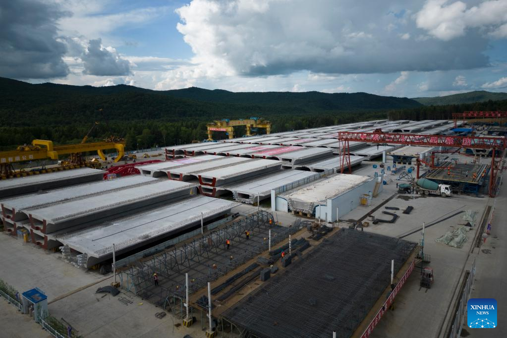 Workers operate at a beam fabrication yard in Yichun, northeast China's Heilongjiang Province, on July 25, 2022. Crossing permafrost regions, the Harbin-Yichun high-speed railway will total approximately 300 kilometers, connecting the cities of Harbin, Suihua, and Yichun. (Xinhua/Zhang Tao)