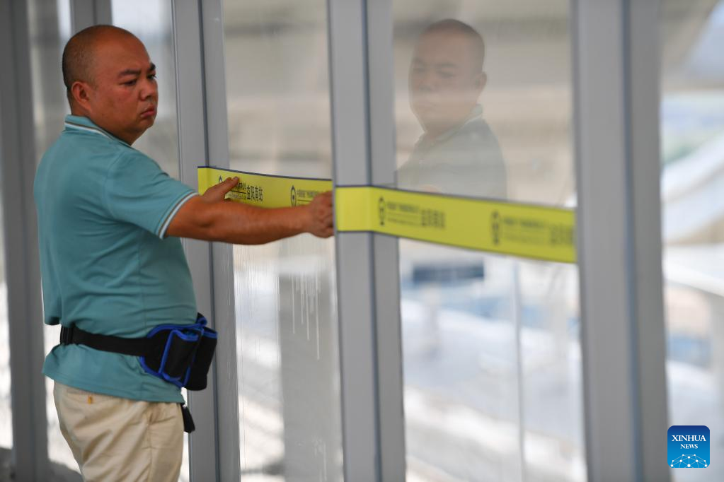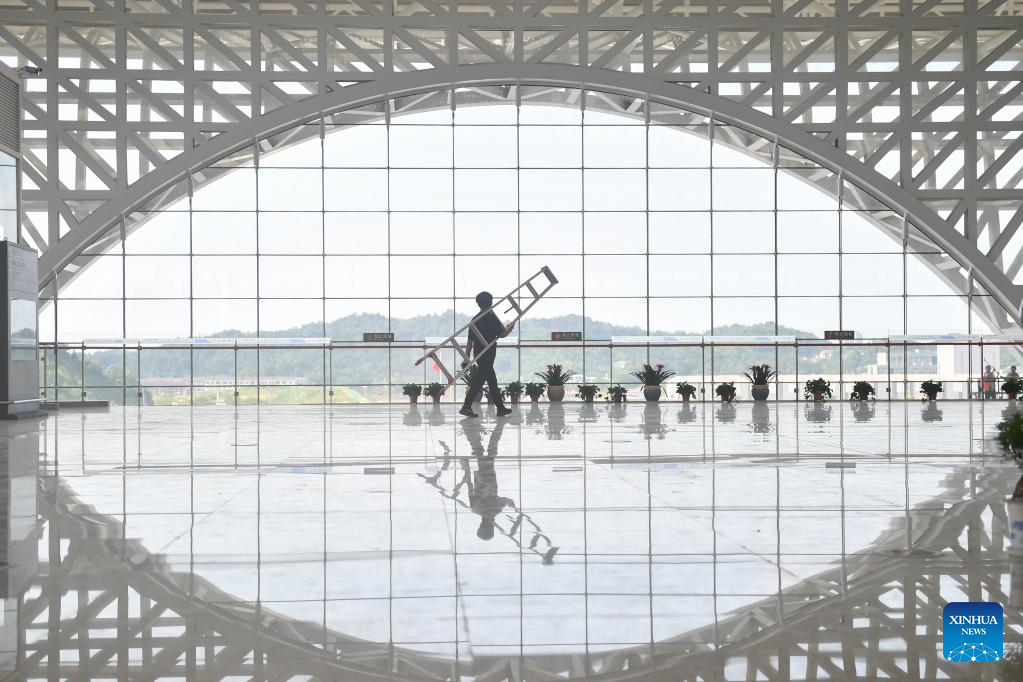 A staff member inspects the waiting hall of the Yiyang South Railway Station in Yiyang, central China's Hunan Province, July 26, 2022.