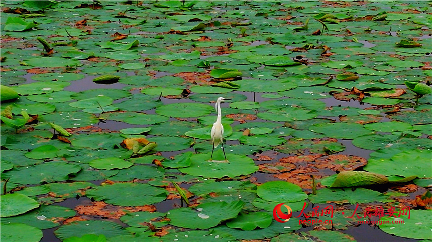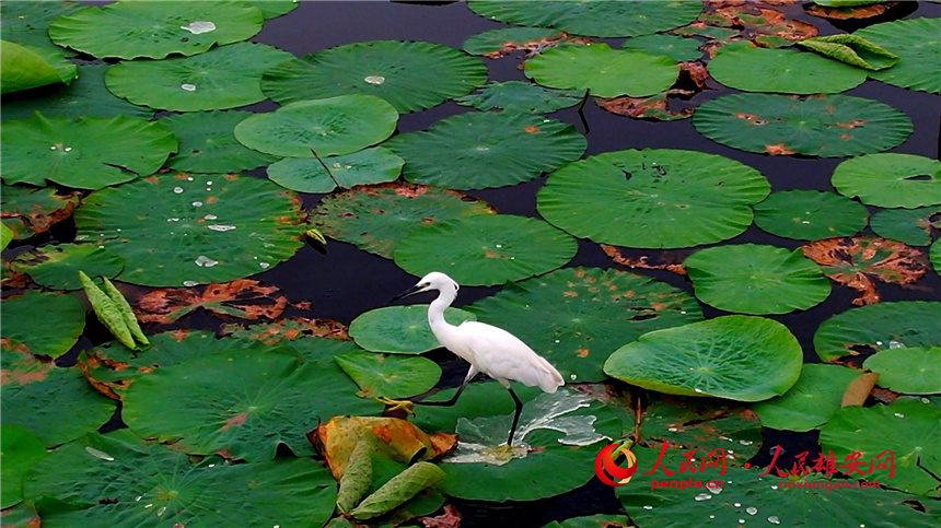A little egret stands on a lotus leaf at Baiyangdian Lake in the Xiong’an New Area, north China’s Hebei Province. (Photo/Gao Teng)