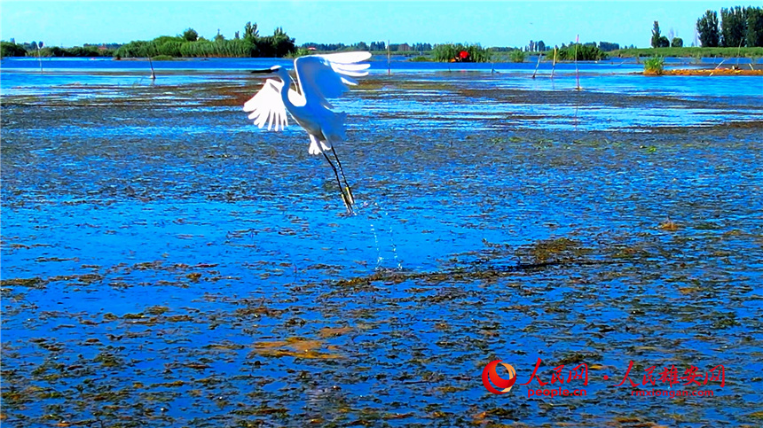 A little egret flies over Baiyangdian Lake in the Xiong’an New Area, north China’s Hebei Province. (Photo/Gao Teng)